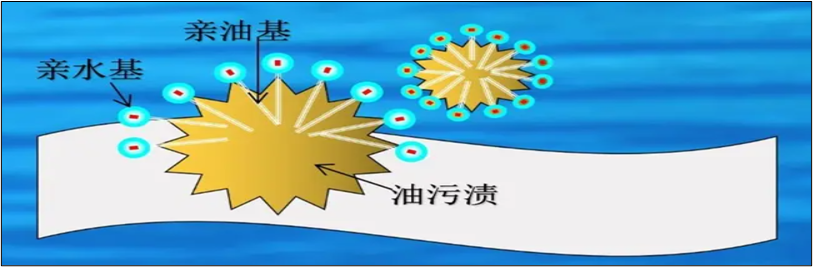 是多种阴离子型表面活性剂与长碳链双异构化脂肪族二元醇聚氧乙烯醚复配产物,具有渗透快速、均匀、润湿性、乳化性等特点;可在“水液-油污-板结污垢”三相界面快速渗透,在除油(油性膜渣)过程中可将大片油污通过渗透,使槽体表面的油污缩聚成“小球型油滴”或“线状油流”或“小薄片毛绒状油旋”,脱离槽体及管道表面,从而实现快速去污的目的。