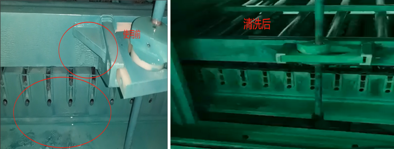 目前的显影槽用传统的碱洗、酸洗、干冰保养以及市售的A、B清槽剂等方法均不能将显影槽内的老垢、膜渣等彻底的清楚干净;本公司所生产的碱性清槽剂,乃针对此项问题专门深度开发的产品;通过渗透、消粘、剥离的原理;能够深度深透结胶的老垢;去除粘性、剥落污垢的强大功效;将附着在设备、管道、槽体上的干膜渣、油墨渣等污垢完全清洗下来。同时不改变原来保养的操作习惯。