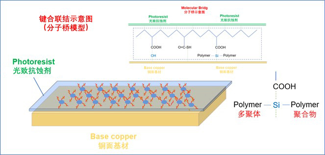 键合剂与铜面上光致抗蚀剂发生的键合联结(分子桥)示意图