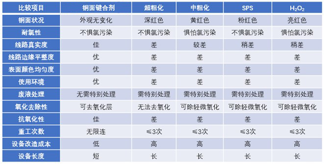 铜面键合剂与各化学前处理优缺点比较
